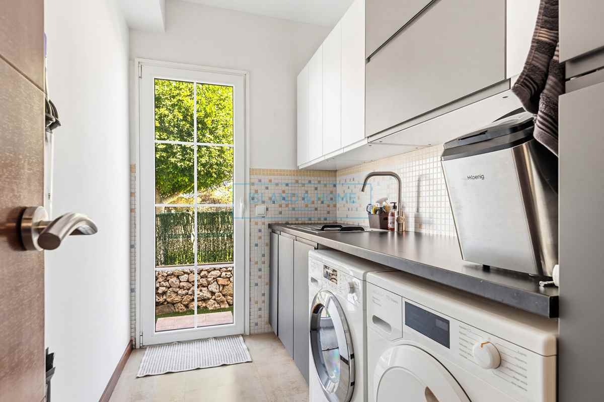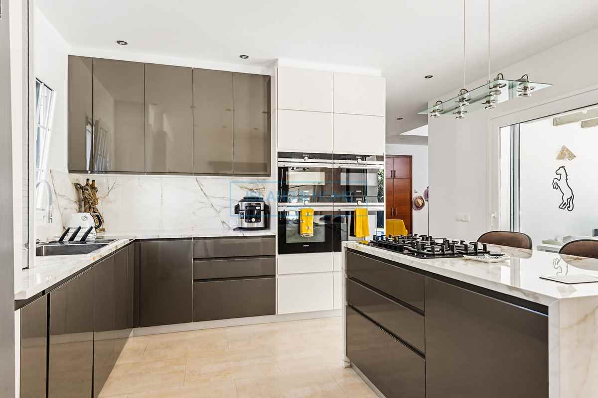 The villa is set back from the road, offering privacy and a sense of arrival. The front door opens into a spacious entrance hall, complete with a guest toilet and a utility room with rear access. From here, you are seamlessly led into the kitchen—an immaculate, light-filled space that forms the true heart of the home, effortlessly connecting with both the lounge and the outdoor living areas. The kitchen is fitted with top-quality appliances, including four ovens—one of which is a steam oven—offering both versatility and a premium cooking experience.