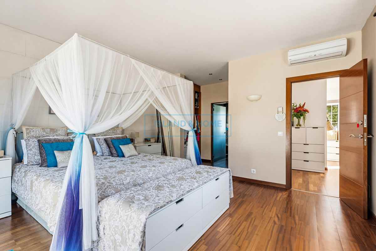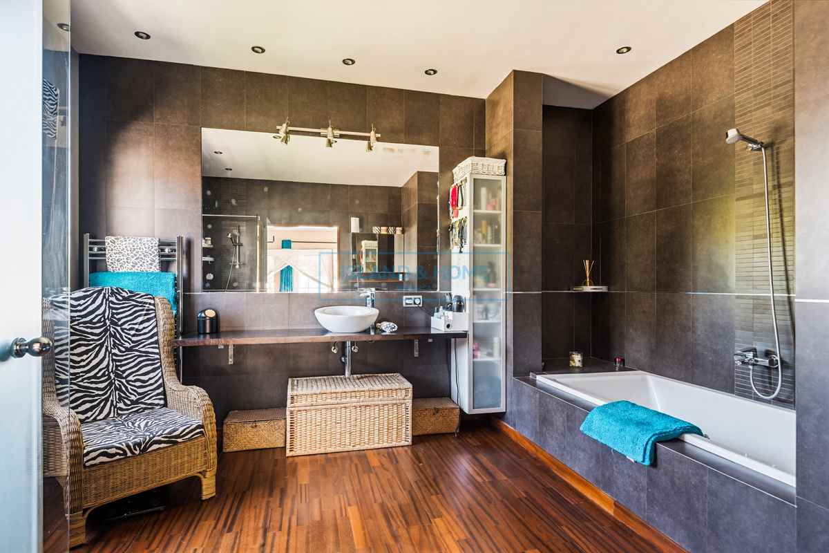 Inside, the lounge benefits from dual-aspect windows, flooding the room with natural light. A striking Mares stone feature wall adds warmth and character, while air conditioning ensures comfort throughout the year. The ground floor also accommodates four spacious double bedrooms, two of which have en-suite bathrooms, alongside a separate family bathroom. All bedrooms are thoughtfully designed, featuring built-in wardrobes and air conditioning. Underfloor heating throughout the ground floor provides year-round comfort.